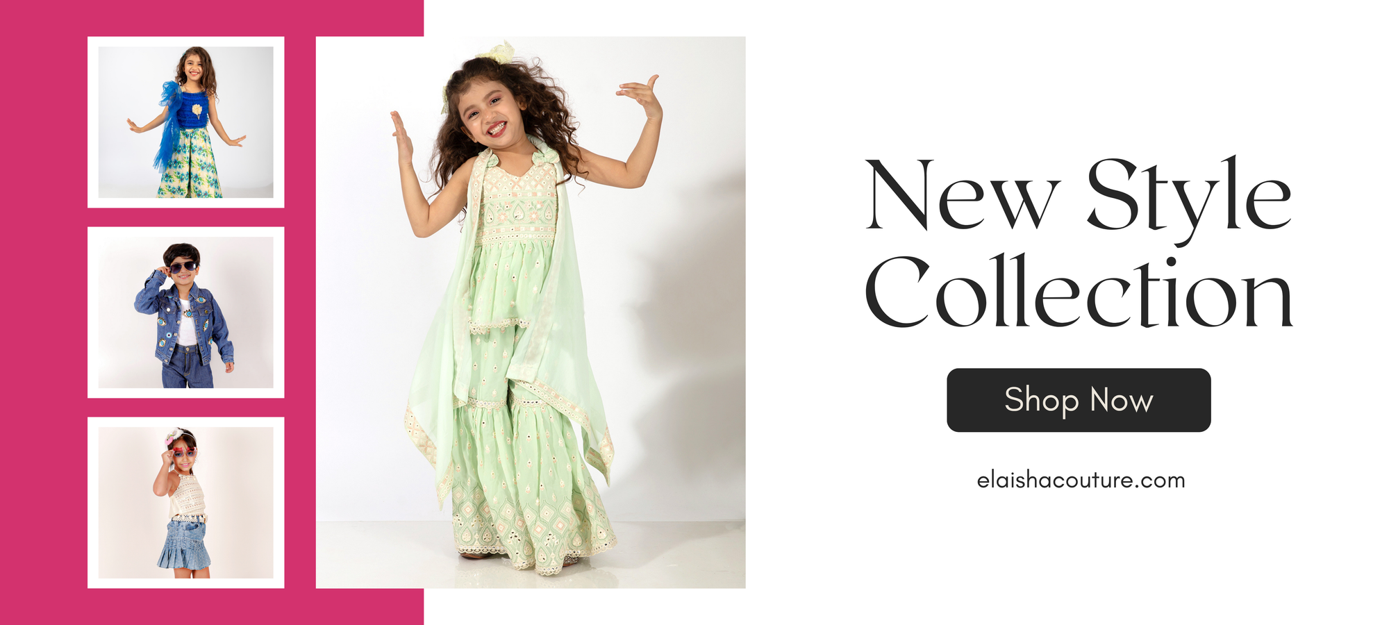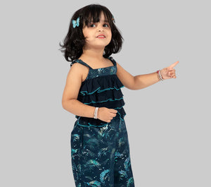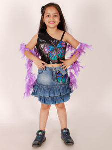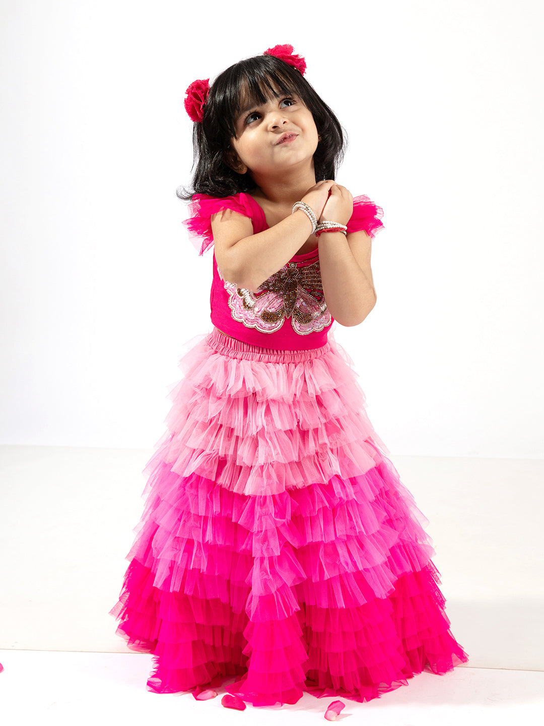 Elaisha Girls Crop Top with Butterfly Motif & Gradient Tiered Net Skirt Set - Pink & Baby Pink