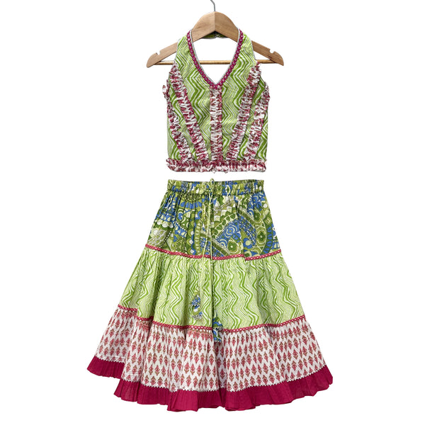 Elaisha Woven Cotton Sleeveless All Over Printed Top With Lehenga-Olivegreen & Pink