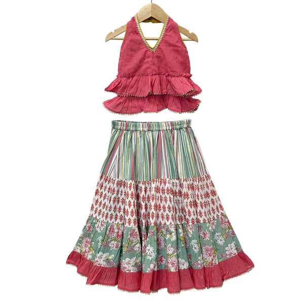 Elaisha Woven Cotton Sleeveless Solid Top With All Over Printed Lehenga-Coral & Olivegreen