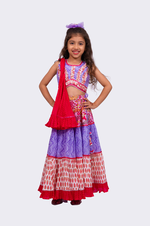 Elaisha Woven Cotton Sleeveless All Over Printed Top With Printed Lehenga-Lavender & Pink