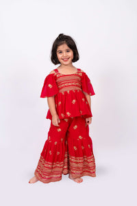 Elaisha Woven Brocade Half Sleeves Embellished Top With Palazzo-Red