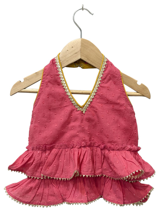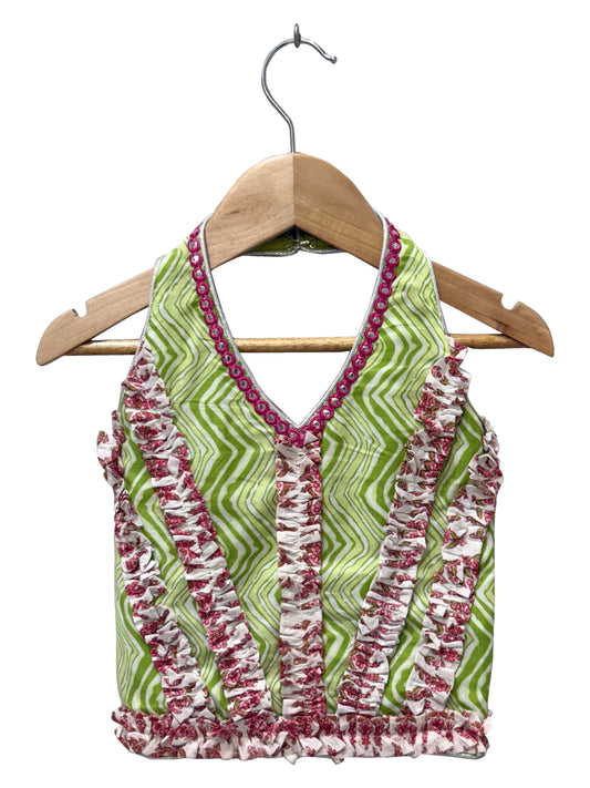 Elaisha Woven Cotton Sleeveless All Over Printed Top With Lehenga-Olivegreen & Pink
