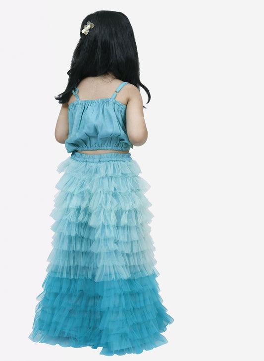 Elaisha Woven Sleeveless Placement Embroidered Top With Net lehenga-Blue