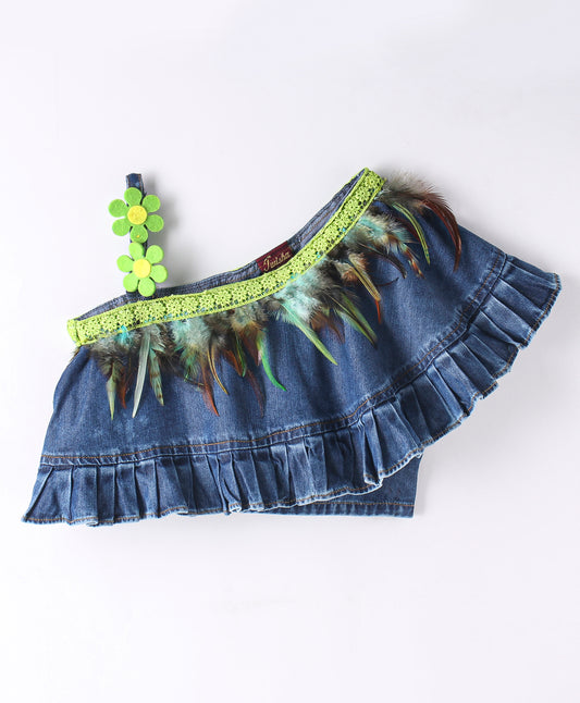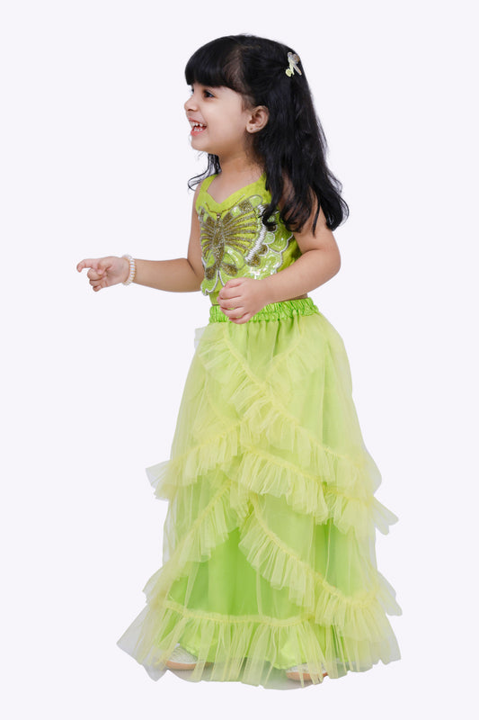 Elaisha Woven Embellished Denim Top With Skirt With Beautiful Butterfly Patch - Blue & Limegreen
