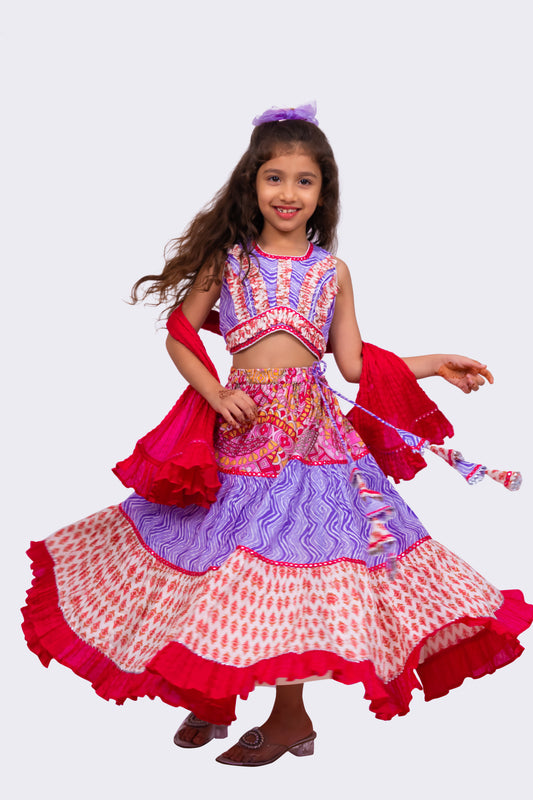 Elaisha Woven Cotton Sleeveless All Over Printed Top With Printed Lehenga-Lavender & Pink