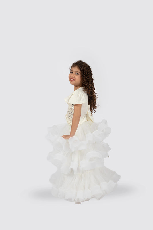 Elaisha Flutter Sleeves Mirror Worked & Ruffle Detailed Top With Skirt Set - Off White