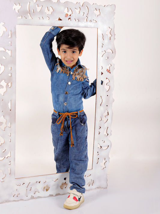 Elaisha Boys Emebellished Fringe Long Sleeves Denim Shirt & Jeans - Blue